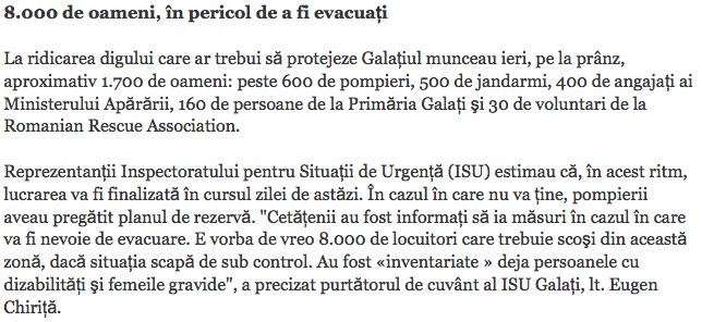 Andrei: N-am fost in America, unde inteleg ca ai stat o vreme. Ma uit rar, cand am timp la filme. Si cand vad, in filme, solidaritatea americanilor in cazuri de sinistre imi vine sa cred macar vreo 25% si tot este mare lucru. De acord cu tine ca au si pentru ce sa fie solidari. Au ce apare. In cazul Galatiului, estimarea catastrofica a consecintelor unei inundatii, cred ca face parte dintr-un scenariu care vrea sa pregateasca oareshce licitatii. La urgenta. TOTI cei vizati de inundare s-au pregatit din timp. Sunt adapostiti. La Galati si Braila nu vine puhoiul de apa sa duca la vale nu’shce. Creste numai apa. Fara socuri. Far’ de valuri. ” Al doilea razboi mondial “..