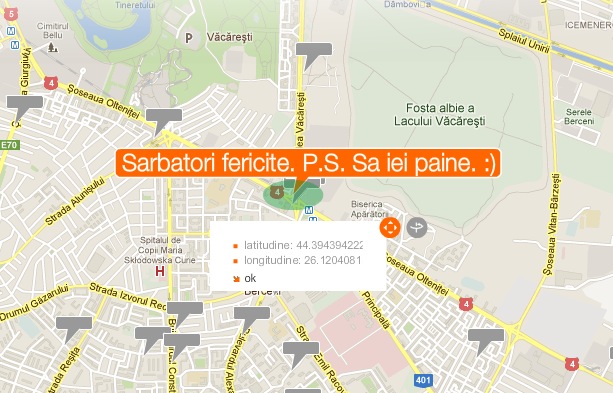 Cum funcţionează? Scrii un mesaj (de pe smartphone, nu-i nevoie să ajungi la un computer), apoi intri şi îl poziţionezi pe harta de pe www.scriepecer.ro fix unde vrei să-l vadă persoana căreia vrei să-l adresezi. Poţi să-i setezi chiar şi orientarea, ca să-l vadă dintr-un anumit unghi. Apoi, după ce mesajul îţi e aprobat şi devine vizibil pe hartă (durează câteva ore, însă există şi un set de mesaje predefinite, ca text sau ca obiecte 3D, care apar instant) îi poţi trimite destinatarului, tot prin www.scriepecer.ro, un email cu coordonatele locului unde mesajul va apărea pe cer. Ca să vadă mesajul, destinatarul trebuie să folosească un smartphone cu cameră şi GPS, compatibil cu una din platformele Android/iOS/nokia ovi/blackberry, pe care să instaleze aplicaţia Layar (iată linkurile de download pentru Android şi iOS) şi, în cadrul acesteia, “layer-ul” dedicat pentru această campanie, numit scrie pe cer. Apoi, trebuie să mearga în locul indicat şi poate vedea mesajul scris chiar “pe cer”, prin tehnologia “augmented reality”, pe ecranul telefonului.