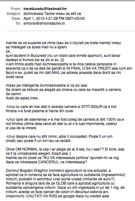 La un simplu search dupa “Horatiu Radu”,asa cum reiese din mailul dumnealui, gasesc un domn bine,la cravata si costum, din ministerul afacerilor externe. http://old.mae.ro/index.php?unde=doc&id=33553&idlnk=0&cat=2 Sa fie acesta oare “studentul” care a trimis mailul ? 😐