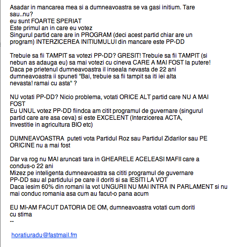 Cine pruna mea se crede friptul asta??? Poate e vre-un Aristotel, geniu universal si noi nu stim ?! 😆 In spatele unui mail molipsitor poate sta oricine, un student, un politician, sau un cersetor cu smartphone. (spamerii astia infecti nu ma impresioneaza.) Chiar daca gresim votand pe cineva anume, sau nevotand deloc, eu cred ca este cel mai bine este sa o facem cu capul nostru. Pana la urma votezi pe cineva pentru putinul care il sti despre el si pentru ceea ce speri sa faca. Nu are rost sa ne facem iluzii… votul este un drept formal.