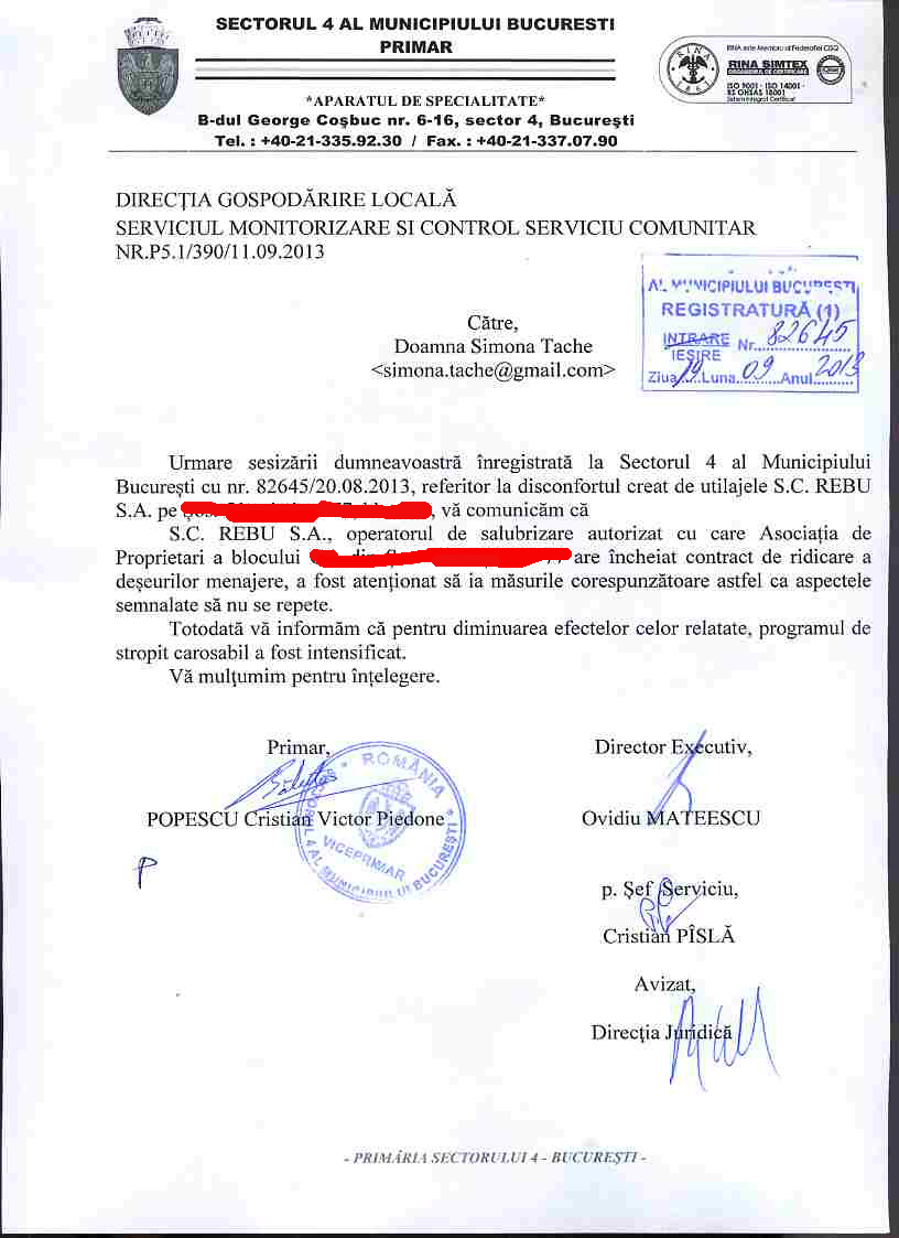 Simona, la ce adresa de email ai scris la primarie? Ca si eu am scris si n-am primit niciun raspuns 🙁 Tot in sectorul 4 stau si eu. Multumesc!