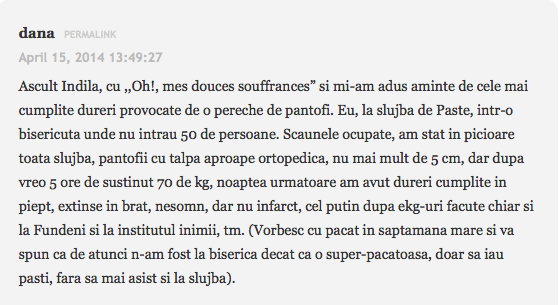 Am deschis discuție, acum ceva vreme, despre femei și pantofi, mai exact despre cât de dispus e sexul slab să suporte tortura unor încălțări incomode. Maica mia, cu ce povești horror s-a lăsat din partea cititoarelor! 😆 Am râs și am plâns cu lacrimi, da’ mai mult am râs. Vi le redau, mai jos, pe cele mai mișto. Preferatele mele sunt ultimele două mărturii, ultima fiind chiar genială. 😆