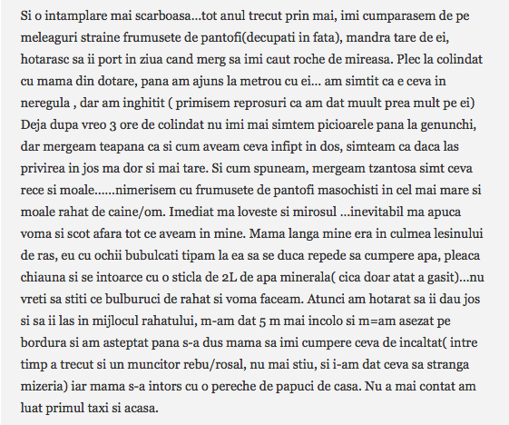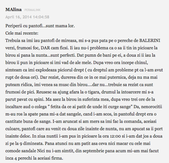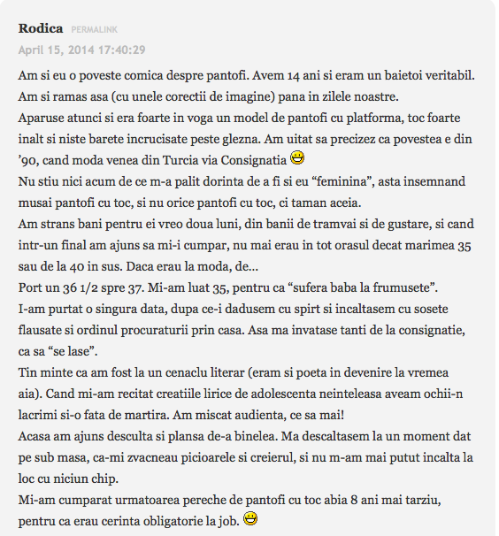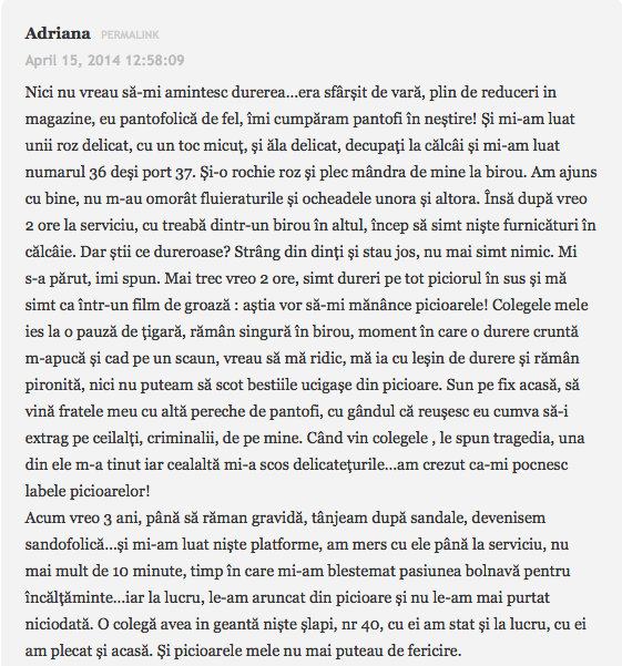 am si eu o patanie cu pantofii, nu din cauza tocurilor, ci din cauza marginilor dure. Era prin 2009, la o petrece de absolvire cu colegii. Imi luasem o pereche de pantofi cu toc din lac, mov, draguti, decupati in fata cu toc de aprox. 8 cm pe care, am facut prostia sa-i inaugurez fix in acea zi. Si ma iau eu de acasa, si ma duc, cobor scarile, deja simteam ca ma jeneaza pana sa ajung in statia de autobuz, bun, ajung si in centru intr-un final, si mai trebuia sa merg vreo 500 de metri pana sa ajung in locul in care se tinea petrecerea. Nu va spun ca deja, aveam basici, pana la sfarsitul serii, fiindca ne-am mai mutat “resedinta” dintr-un local in altul, un fel de pub crawling, “crawling” pe bune, basicile mi se sparsesera ca pe la finalul noptii aveam deja rani, basici sparte, si sange care se lipise efectiv de pantof si piele, incat nu stiu ce era mai dureros: sa-i “desprind” cu carne cu tot ca sa-i pot da jos, sau sa umblu in continuare cu ei asa simtind cum ma rod pana in carne vie… Pana la urma, nemaisuportand usturimile, m-am dus la baie, mi-am bagat picioarele in chiuveta sub jet de apa rece, am scos pantofii, cu tot cu piele, (ahh mi se strepezesc dintii si acum ), m-am sters cu hartie igienica (nah, stii voi cum e in club dupa o noapte intreaga, de abia mai gasesti si hartie) si am pornit-o pe jos spre casa, la 4 dimineata, nu circulau autobuze, asa ca am parcurs vreo 5-6 km pe jos, cu pantofii in mana. Nu i-am mai purtat niciodata, pentru ca erau mult prea duri, chiar si daca lipeam pansament.Dar, viata mea n-am avut talpile mai murdare, facusem pana si rani pe talpa de la umblatul desculta :))