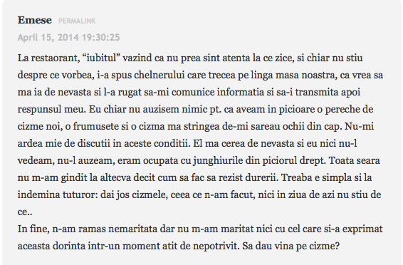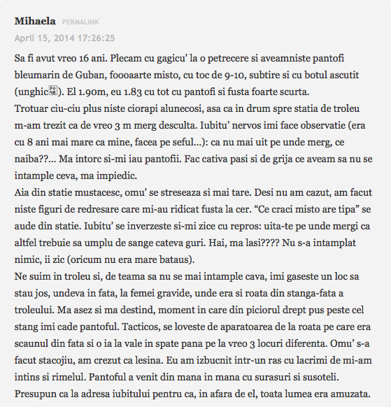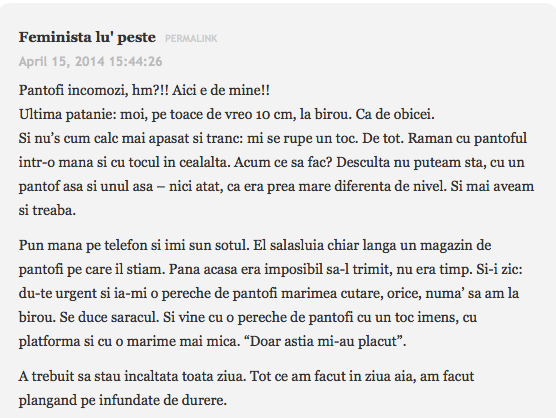 Mai mult de 30 de euro pana atunci nu dadusem pe pantofi. Primesc cadou o pereche de stilleto, care au costat in jur de 200. Foarte mandra de ei, ii purtam cu mare drag mai ales cand voiam sa fac o impresie buna. In vara lui 2012, observator intr-o sectie de votare. Am inceput numai bine, cu probleme, nu mi s-a permis accesul in sectie. Seful meu mi-a zis nu te muti de acolo, pana nu te lasa sa intrii. Si unde sa stai jos timp de 3 ore in curtea unui liceu, unde nu era nicio banca, iar pe bordura nici nu se punea problema – cand eu purtam tocuri cui de 12, o fusta scurta si mai caram si o hudubaie de laptop dupa mine? Intru pana la urma in sectie, dupa o serie lunga de telefoane si amenintari. Numai ca nimerisem intr-o sectie de vot de toata frumusetea: cu multi votanti, cu scandalagii, si reprezentati ai partidelor care incercau sa fure voturi. La numaratoare mi-am scos frumos pantofii, mi-am strans fusta sub mine si m-am cocotat pe catedra sa pot vedea voturile. Si toata lumea ma intreba, mai rezisti? Esti de 16 ore pe tocuri. Si eu ma dadeam cocos, eiiii, ma simt minunat.