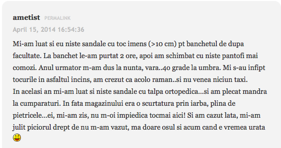 Imi place sa port tocuri, ( mai ales cui) – chiar daca sunt inalta. Am gleznele subtiri si piciorul arata frumos atunci cand port tocuri cui. La banchet in a 12a, toate colegele mele s-au schimbat de pantofi dupa 3-4 ore. Eu stat de la 8 seara pana dimineata la 5. Dar cand am plecat din locatie (hotelul nostru era la 800 de metri distanta, pe munte) sandalutele in mana si cu picioarele direct prin parau, fara sa tin cont de dres. Mi-am racorit picioarele si a doua zi ma simteam ca noua. Sandalute cu toc pe care le-am uitat intr-un taxi in Bucuresti 😕