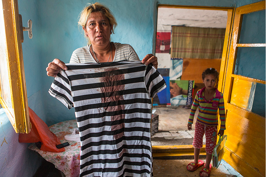Scoate dintr-o sacoșă roșie o bluză albă, cu un tigru, și un tricou în dungi. Ambele au pete mari de sânge uscat, maroniu. Sunt probele din ziua în care bărbatul a băgat cuțitul în ea pe stradă. Le păstrează cu sfințenie. Una dintre fetițe, cu agrafe cu flori de plastic în păr și piciorușe subțiri, ca două chibrituri, băgate într-o pereche de șlapi imenși, se uită cu ochi mari și gura deschisă.