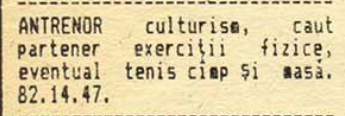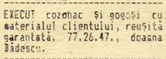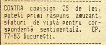 Mie imi suna a profesionisti .Cei care redactau mesajele ar putea scrie o carte.In rubrica Nota am aflat ca populatia lasa “aprecieri emotionante”: “sa va ajute Dumnezeu,ca tare v-ati mai gandit la oamenii batrani si saraci” sau “Imi purtati noroc:prin ziarul dumneavoastra mi-am cumparat video si tv color.Acum vreau sa vand casa.Multumesc si spor la bani!”
