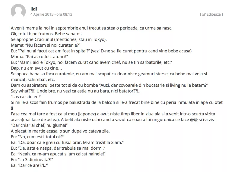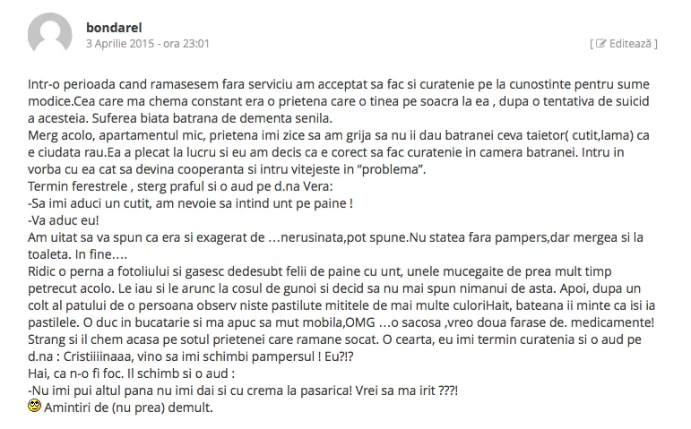 In urma cu 10 ani, ai mei s-au mutat dintr-un apartament la parter intr-un apartament la etajul 1. Si cred ca maica-mea nu pricepuse inca ca are vecini dedesubt. Intr-un PasteCraciun, s-a gandit mama mea sa faca pomeni, asa ca a inceput cu inceputul: s-a apucat sa faca snitzele. Adica s-a trezit la 3 dimineata si s-a apucat sa le bata. Va dati seama cam cum ne-au cunoscut vecinii 🙂