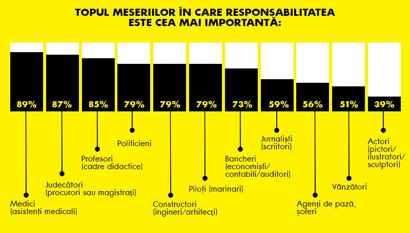 Într-un studiu efectuat la începutul acestui an, pe un eșantion național reprezentativ, de 1088 respondenți (bărbați și femei cu vârsta peste 16 ani), românii și-au spus părerea vizavi de meseriile în care responsabilitatea este extrem de importantă. Iată rezultatele: