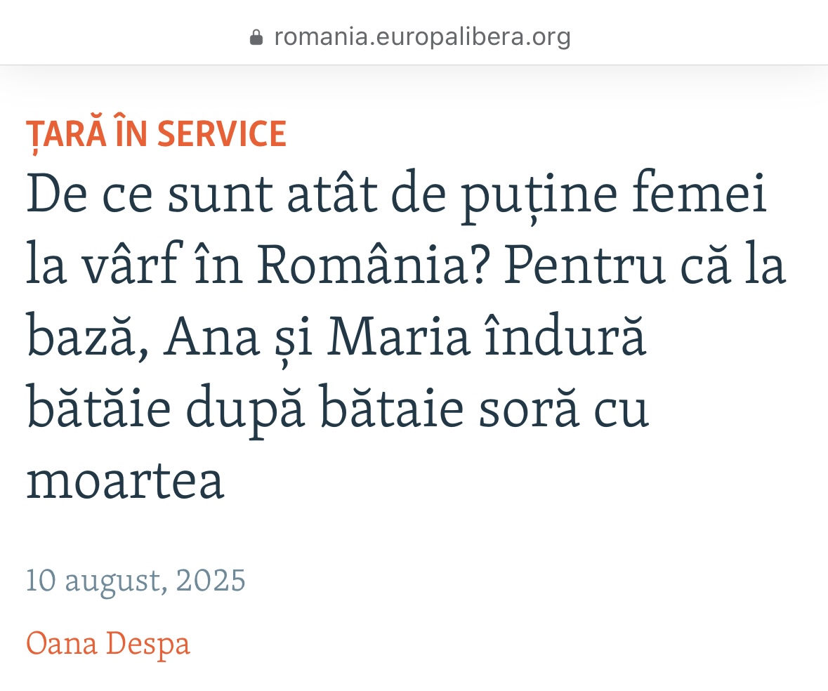 A făcut Oana Despa, pentru Europa Liberă, un material mare și foarte documentat, despre realitatea abuzivă a femeilor din România. Nu, nu a celor din marile orașele, unde pare că predomină emanciparea (joburi stabile, ascensiune profesională, parteneriat cu soțul pentru treburile casnice, celibatare asumate sau femei care aleg să nu aibă copii), ci a restului țării, în care enorm de multe femei abuzate se zbat singure pentru supraviețuire. Povești cu victime și agresori există și în marile centre urbane, dar aici victimele au șanse mai mari să iasă din abuz, având acces mai ușor la un job stabil, rețele de sprijin și servicii sociale.