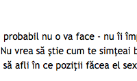 Dacă cuplurile ar face și conversație în timp ce fac sex, din punctul de vedere al bărbatului, ea ar arăta așa: – Auzi? Nu vrei să ne filmăm puțin? – Nu, că nu sunt machiată și n-am apucat să ajung la vopsit. – Atunci vorbește-mi murdar. – Auu, vezi că mi-ai înfipt un cot în […]